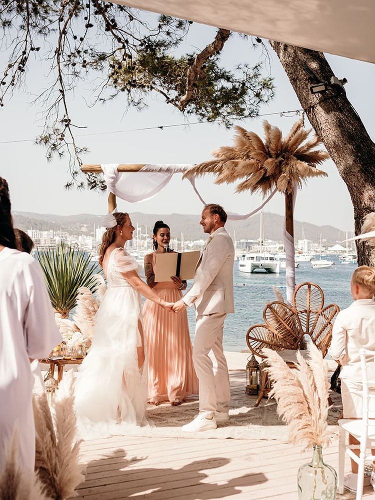 A boho wedding in Ibiza is all about relaxed, organic beauty — think barefoot ceremonies, natural textures like macramé and woven rattan, dried flowers and pampas grass, long wooden tables under the stars, and an atmosphere that feels effortless rather than formal. The island's landscape does most of the decorating.